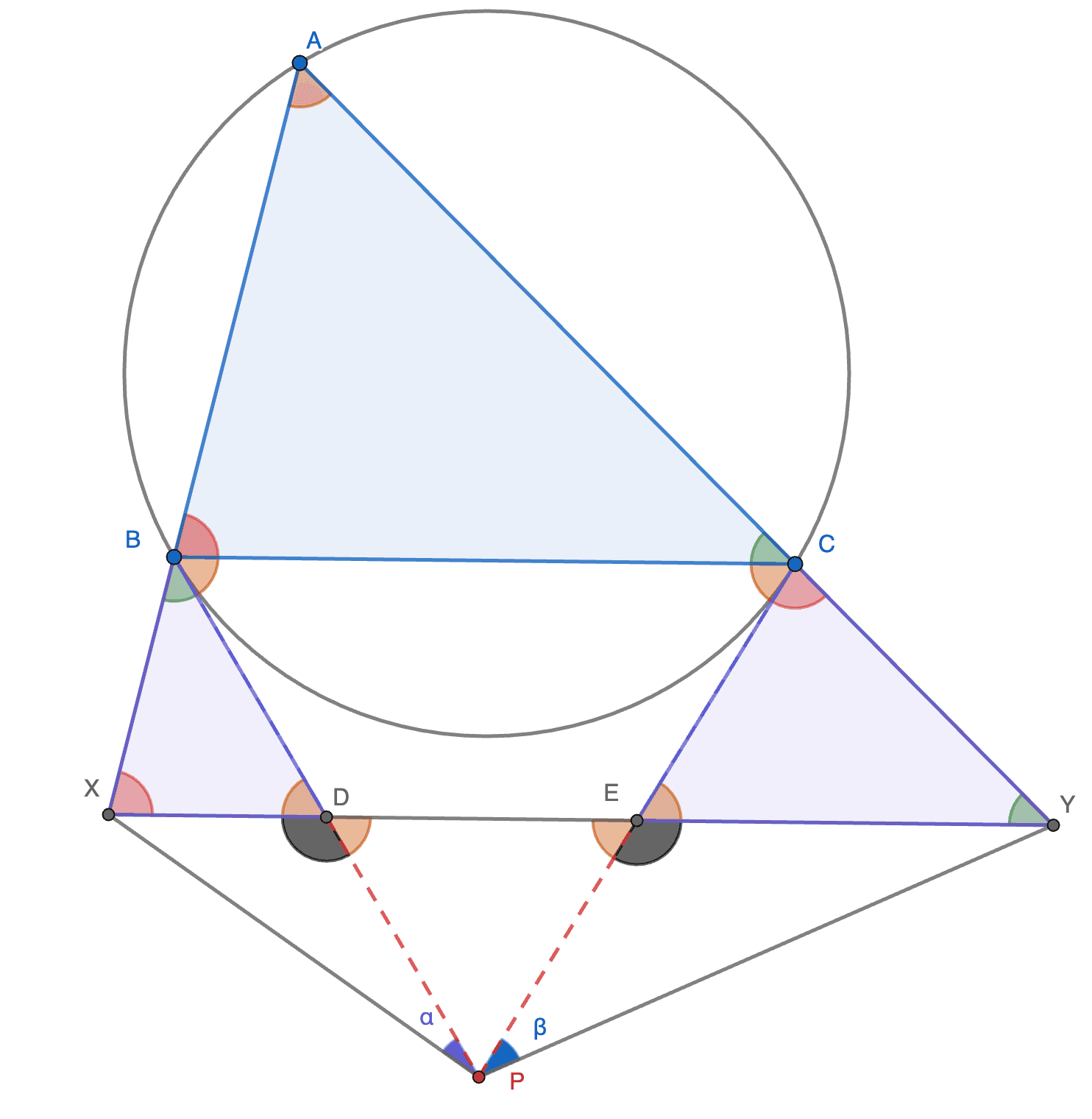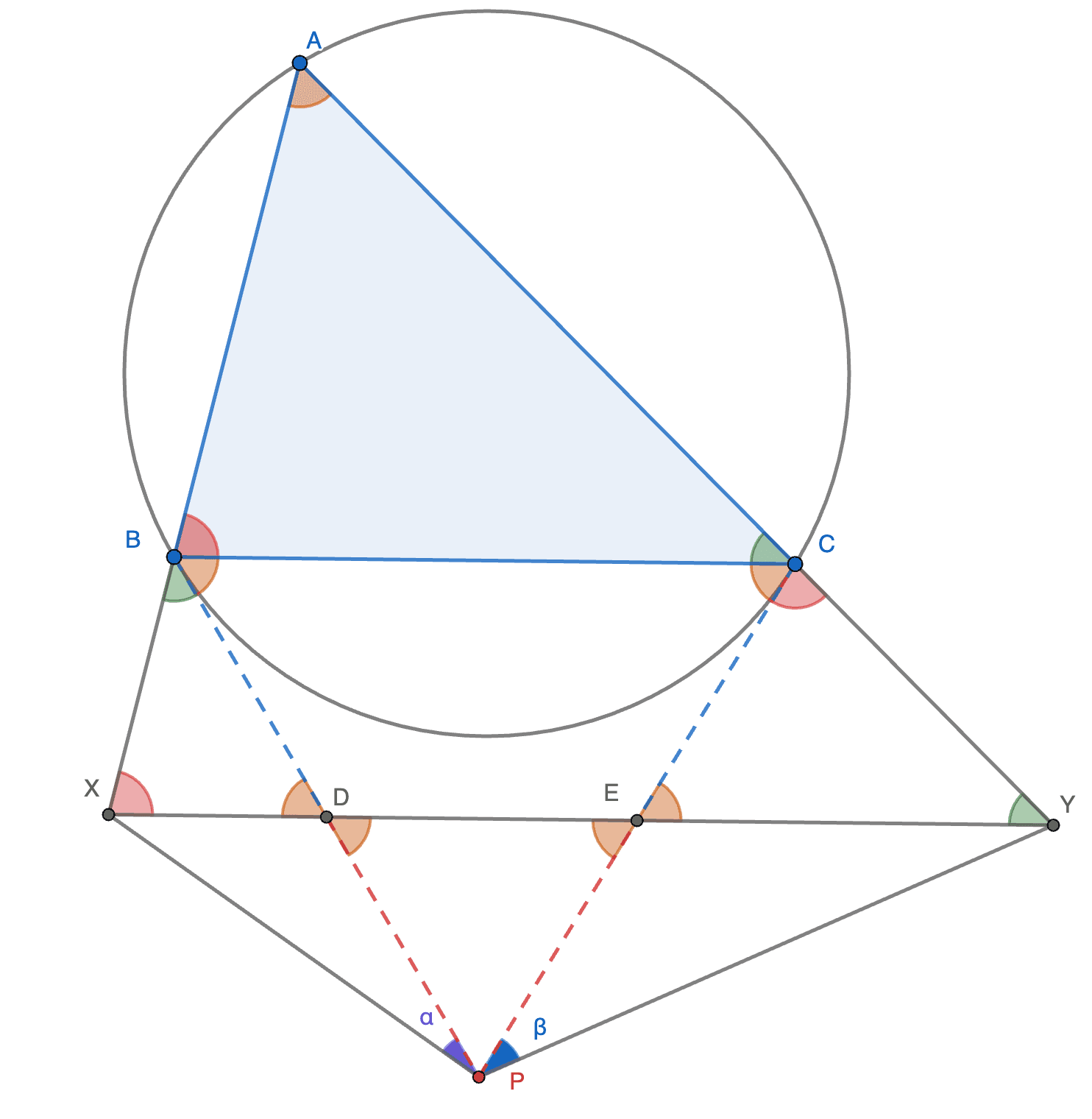 ABC sei ein spitzwinkliges Dreieck mit . P sei der Schnittpunkt der Tangenten an den Umkreis von ABC in B und C. Die Linie durch die Mittelpunkte der Strecken PB und PC treffe die Linien AB und AC in X bzw. Y.